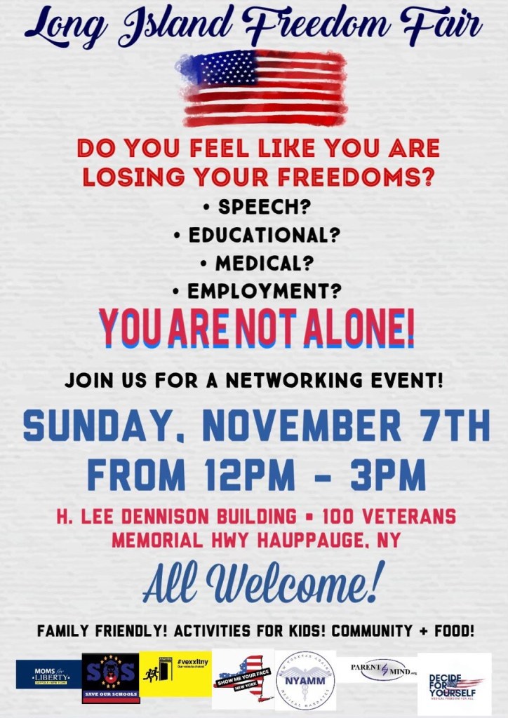 Come to Freedom Fair! Posted byNew York TeachervNovember 5, 2021Posted inProtest November 7th, 12 to 3pm Suffolk County Long Island For more info please contact: – vexxitny@protonmail.com Share this: Click to share on X (Opens in new window) X Click to share on Facebook (Opens in new window) Facebook Like Loading... Related
