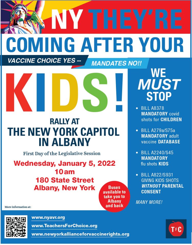 We are going to Albany on Wednesday, January 5, 2022 on the first day of legislative session, and the day Governor Hochul delivers her first State-of-the-State (SOTS) Address. We want to stop a whole list of bad bills (See below) and current really bad policies, like pretending that people who had Covid and recovered have no immunity, firing people who refuse the still experimental shot, vaccine passports, and many others. We want to stop bills that would mandate covid shots for children to attend school, require all adult vaccine records be given to the state and many other bad things. Politicians should not be making medical decisions for us and our children. We oppose any law that interferes with the right to make medical decision without coercion from the state, employers, schools, or anyone else.