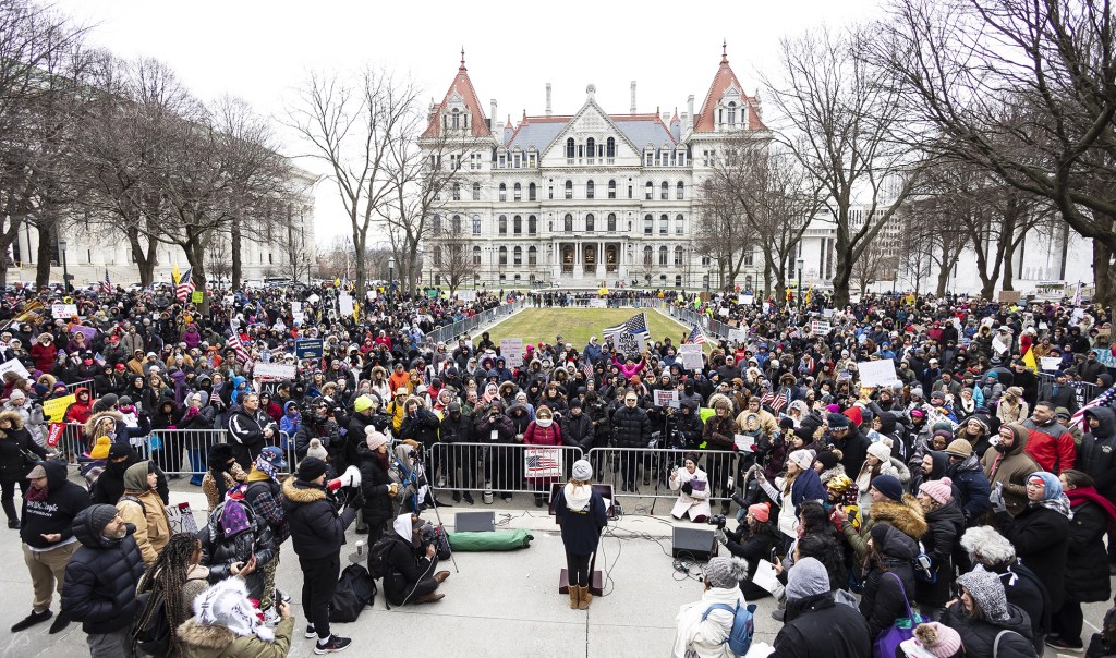 Since early January only people who have proof of Covid vaccination or a negative PCR test less than 48 hours old are admitted to the Capitol or the Legislative Office Building. The rules were put in place in direct response to over 4,000 vaccine rights advocates showing up in Albany on January 5, the first day of the legislative session (pictured above)