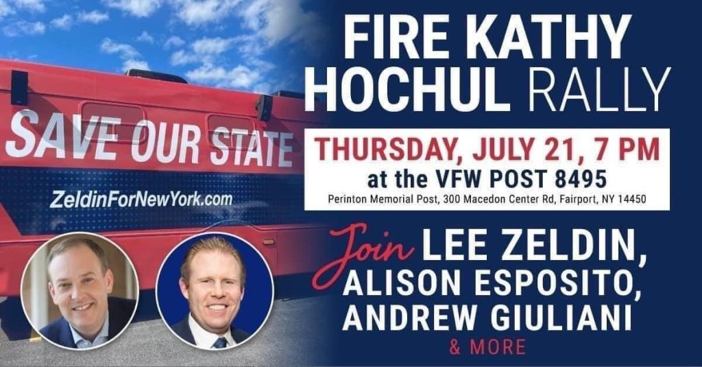 Lewis Friday, July 22nd: https://www.eventbrite.com/e/fire-kathy-hochul-rally-lewis-tickets-383724810237?aff=Volunteers ANDREW GIULIANI will be with LEE ZELDIN