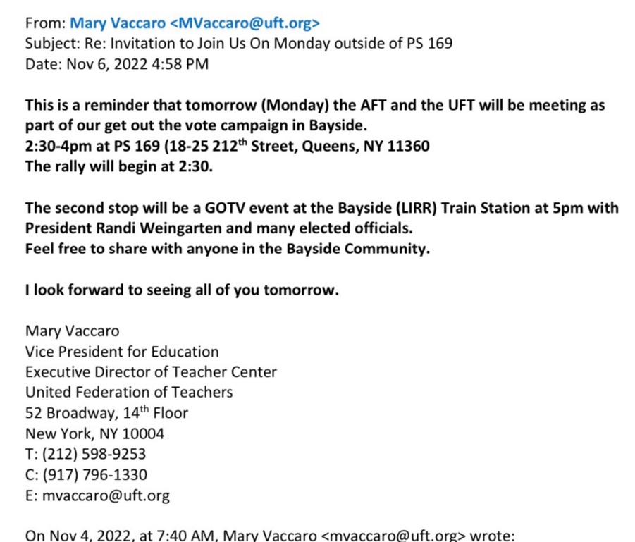 @rweingarten is going to be in Bayside, Qns of all places on 11/7 to push to flip a district which doesn’t want to vote her way anymore.